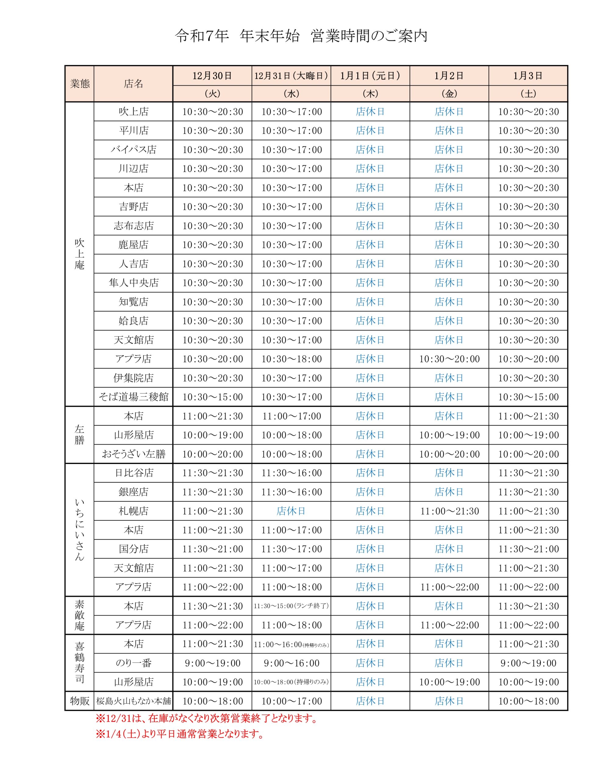 年末年始の営業時間のお知らせ 2025/12/17 いつも各店をご利用頂きありがとうございます。 フェニックス各店、年末年始の営業時間をご案内いたします。 店舗によりまして、営業日・営業時間に違いがございますので、 ご了承頂きますようお願いいたします。 ※12月31日は材料がなくなり次第 営業時間内でも閉店する場合がございます。 ご来店前にお問い合わせください。 ご来店心よりお待ちいたしております。 投稿ナビゲーション « 喜鶴寿司の恵方巻 ご予約のお知らせ喜鶴寿司特製おせち 完売のお知らせ »